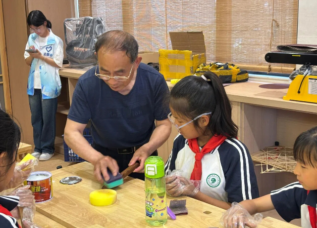 在非遗文化传承与创新中心,80余名中小学生在南通板鹞风筝工坊代表性人物何金泉,江苏省工艺美术名人、非遗传承人夏元安,学校人文社科系张萌老师等在非遗艺术家的指导下深度体验南通板鹞风筝、精细木作技艺、非遗竹编的制作过程。孩子们在浓厚的非遗传承氛围中“玩”得不亦乐乎。