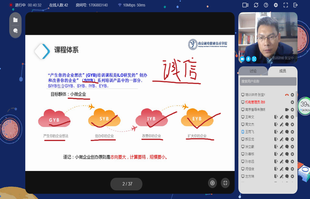2021年10月25日,学校在2021-2022学年第一学期举办了第一期GYB(产生你的企业想法)创业意识培训,报名学习的40名学生全部参加了线上培训,学生全部在网上签到;另外,培训处组织的本学期 PPT培训班也如期开班,学生到课率达100%。