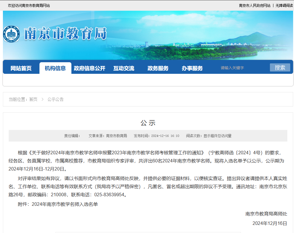 近日,南京市教育局公布了2024年南京市教学名师人选,我校郭晓凤老师榜上有名。