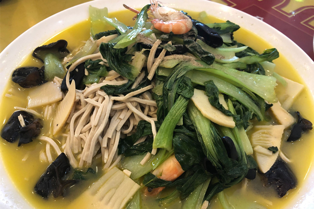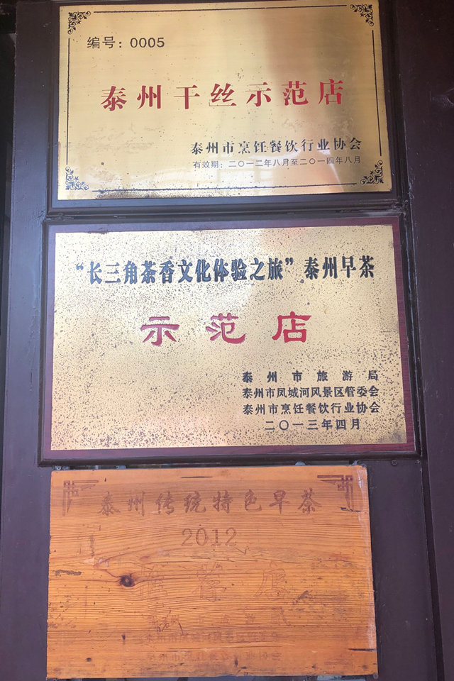 在老街,团队成员详细了解了烫干丝的制作手艺。泰州烫干丝以泰州干丝为主料,以肴肉丝、鲜姜丝、水发海虾米、花生米等为辅料,既是一种大众风味小吃,也是泰州美食文化的翘楚,更是泰州早茶文化中一块响当当的品牌和名片。烫干丝的关键是“烫”,“烫”是颇有讲究的,干丝先在锅中煮沸,旁边放一口缸,缸中贮热碱水,水与碱的比例要看季节而定。将干丝从锅中捞起,倾入碱水缸中,浸泡时间要掌握好,浸久了变成浆水,浸不透则干丝不软。然后用芽姜切成细丝,覆于盘顶,干丝洁白,姜丝金黄,另加一小撮虾米,浇上黄豆酱油和纯香小磨麻油,一经拌和,黄白相间,一碟食毕,齿颊留香。泰州干丝上所用的麻油为特有的小磨麻油,由本地芝麻磨成,这一点也是别的地方学不到泰州干丝精髓的原因。泰州烫干丝又叫泰州五味干丝。主要有两层意思,一是早期泰州五味干丝的配料主要有五种,肴肉、香菜、榨菜、香菇和姜丝,二是说明干丝口味独特,后来五味干丝的名称一直沿用至今。