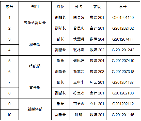 为进一步加强人文系心理气象站的组织建设,切实加强学生干部队伍建设,充分发挥学生自我教育、自我服务、自我管理和自我监督的作用,促进人文系心理气象站工作的全面发展,本着“公平、公正、公开、竞争、择优”的原则,人文社科系心理气象站组织开展了2021年主要学生干部换届竞聘工作。通过学生自主报名、组织推荐、资格审查、竞选答辩、综合考察等环节,结合学生日常工作能力表现。经决定,拟聘曾民庆等10名同学为人文社科系心理气象站主要学生干部。