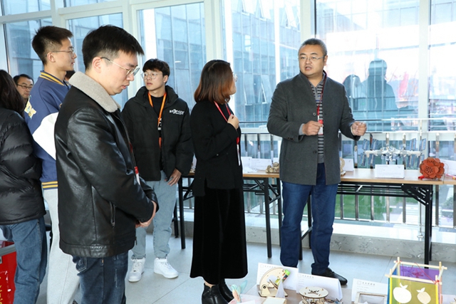 学校党委委员、副院长刁爱军在观展过程中充分肯定了人文社科系“创客月”活动成果,指出人文社科系要以本次创客作品展为契机,要嵌入“高淳”地方特色,要看作品能讲故事,只有建立在故事和内容的基础上,让消费者发自内心地认识它、喜爱它,文创产品才具备长远的生命力。