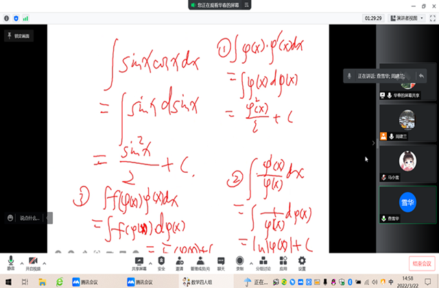 2022年3月22日下午,数学教研室全体老师展开了第5周线上教研活动,会议由华春老师主持,主题是研讨凑微分法求不定积分的教学问题。