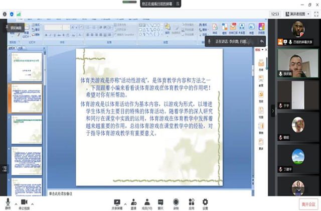 2022年4月5日中午十二点三十分至两点,体育教研室十位老师在腾讯会议开展第七周线上教研活动。本次教研活动由吕中正老师主持,吕老师对如何更好地开展体育游戏才能对课堂教学质量有所提升,从体育游戏在体育教学中的重要性和不同部分穿插不同性质的体育游戏两个方面进行阐述。会上大家也对自己在教学实践过程中开展的相关体育游戏的设置、规则以及开展情况进行研讨。