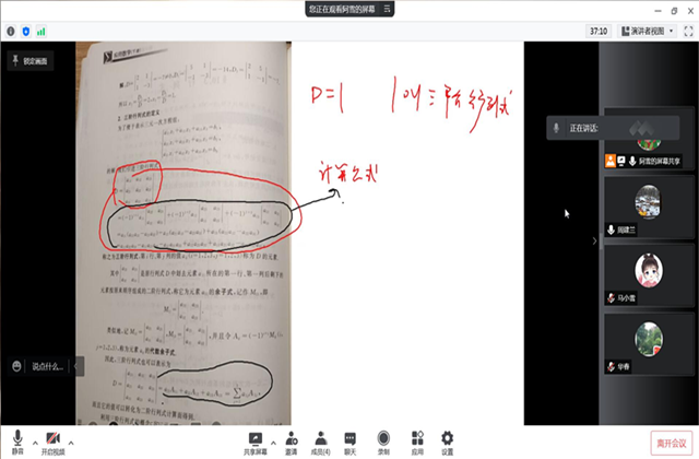 首先查雪华老师介绍了本章重难点,对应的教学设计和教学方法。随后,各位老师根据自身经验,对矩阵概念,计算,行列式计算及应用的教学过程中,学生在学习过程中可能出现过的问题及掌握情况进行了详细讨论。一致认为:第一,在课堂的讲授时,要侧重概念,公式,计算的过程的讲解,弱化理论,强调让学生多操练.第二,为调动学生学习的积极性,尽量将案例与实际相联系,让学生了解矩阵与行列式来源于生活,用于生活,真正体会到数学知识的应用价值。第三,由于是线上课,为保证尽量多的学生参与到课堂中,学生尽可能多的掌握知识,教师要让自己的课更有吸引力,如声音要有感染力,多提问互动,给学生展示的机会,给学生及时的肯定等多种办法.
