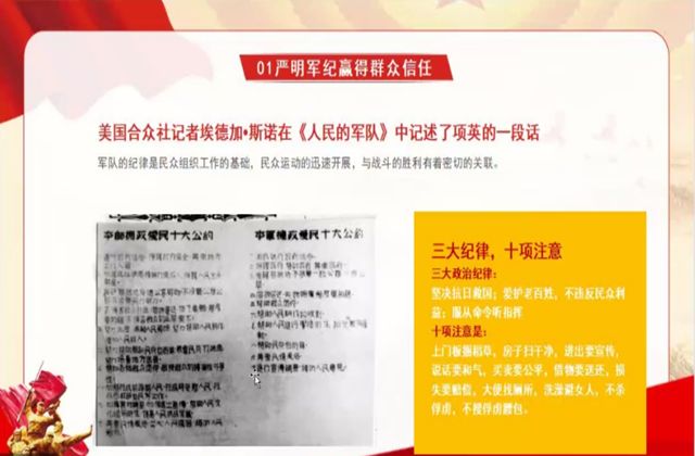 杨劲静老师以《贯彻群众路线,军民鱼水情深》为题围绕新四军军民关系展开讲解。新四军全称是国民革命军陆军新编第四军,隶属于国民党军队战斗序列,是第二次国共合作期间由第五次反围剿失败后留在南方八省进行游击战争的中国工农红军和游击队改编的队伍,也是中国人民解放军的前身之一。新四军历史可以是说是党史、革命斗争史的一部分。