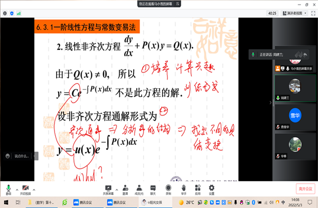 2022年5月3日下午,数学教研室全体老师开展了第十一周线上教研活动。会议由马小雪老师主持,主题是一阶线性微分方程的教学研讨。