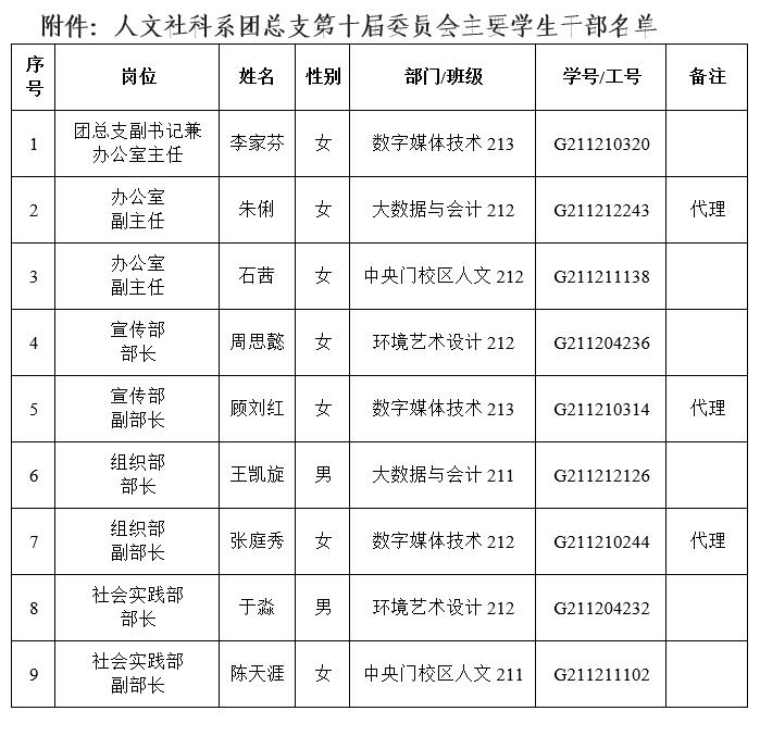 为提高学生干部选拔的透明度,现对拟选拔学生干部进行公示,公示时间:2022年6月9日至6月13日。公示期间,人文社科系团总支和上级团委受理意见、反映。如对拟选拔人选有异议,可以电话、电子邮件或信函等方式实名进行反映。受理人员对反映人和反映的情况严格保密。