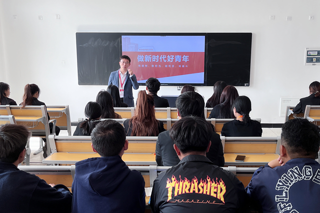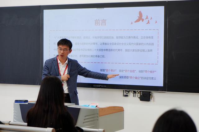 新思想公开课上,人文社科系团总支杨军老师首先领学了习近平总书记在党的二十大报告中寄语青年的内容。杨老师表示,习近平总书记在二十大报告中为中国未来发展擘画出宏伟蓝图,也对党和国家的未来——青年人提出殷切期望,要求“广大青年要坚定不移听党话、跟党走,怀抱梦想又脚踏实地,敢想敢为又善作善成,立志做有理想、敢担当、能吃苦、肯奋斗的新时代好青年,让青春在全面建设社会主义现代化国家的火热实践中绽放绚丽之花。”