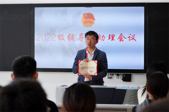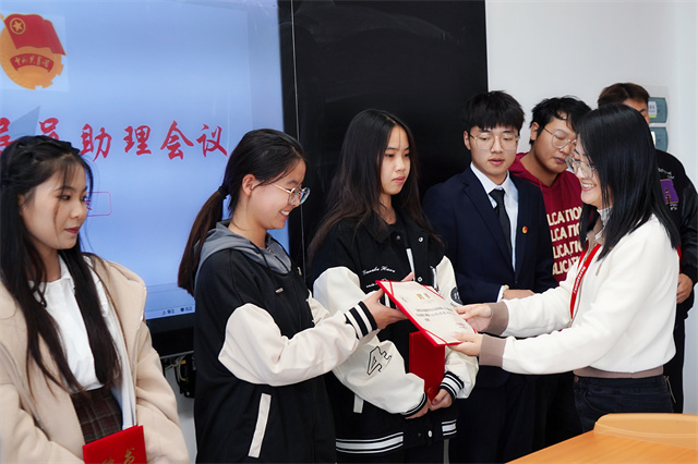 人文社科系党支部副书记叶绘在交流会上为12位辅导员助理颁发了聘书。叶书记对12位同学的成功工作表示祝贺和感谢,并希望辅导员助理们能够保持自身良好状态,继续做好榜样力量,在新的更大舞台绽放光芒、成就自我。