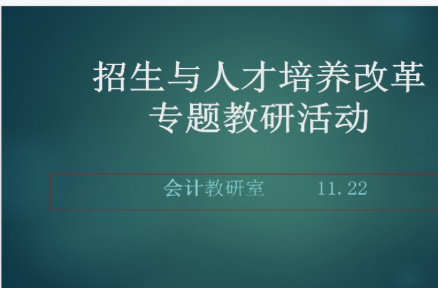 为深入贯彻落实《国家职业教育改革实施方案》及《国务院关于深化考试招生制度改革的实施意见》,进一步推进大数据会计专业教学质量的提升,11月22日下午,会计教研室召开招生与人才培养改革专题教研活动,全体教师出席会议。本次会议由薛蓓蓓老师主持。