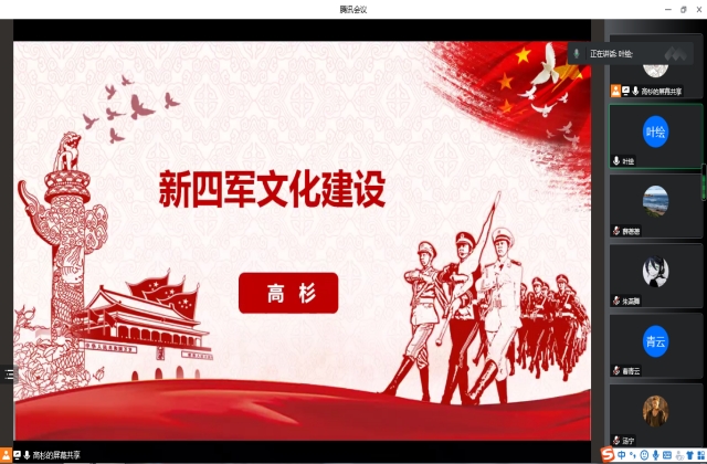 高杉老师以《新四军文化建设》为题,一开始就提出新四军自创建之日起,就始终把开展文化工作作为部队全面建设的一项重要内容,大力进行部队文化建设。随后从“新四军战地服务团的文化宣传”,“新四军教导总队的文化教育”,“新四军的报刊杂志图书及书店”三方面详细介绍了新四军的文化建设。最后,她强调新四军文化建设的现实意义,文化建设必须要善待、善用知识分子,文化建设必须把民族形势与时代内容有机结合起来,文化建设内容必须注重多样化。