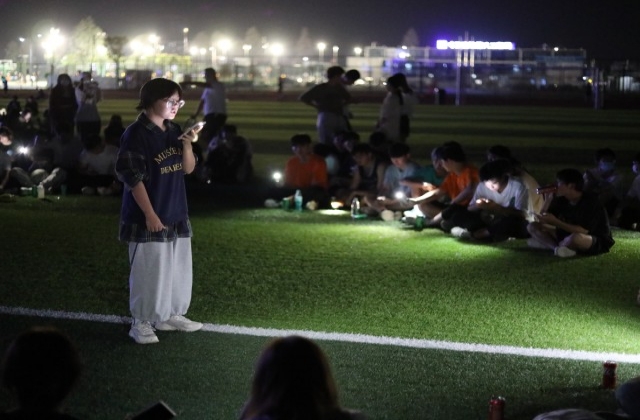 10月2日晚,学院操场上欢歌笑语,喜迎国庆歌唱会正热闹地举行着。Rap、歌谣、流行歌曲、舞蹈等各类节目赢得现场阵阵欢呼。同学们以这种形式表达着对祖国的热爱!