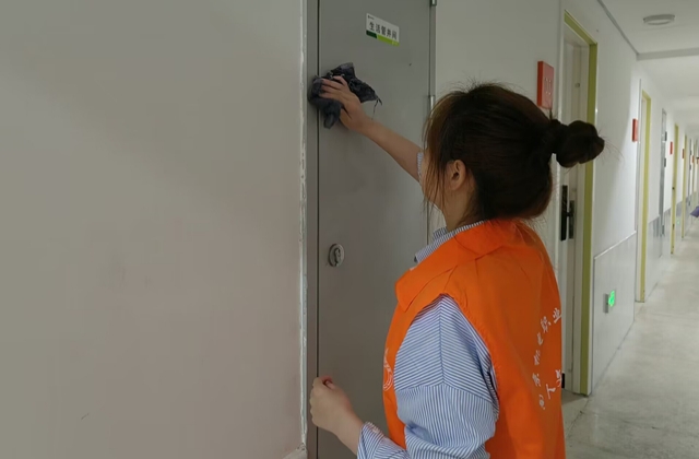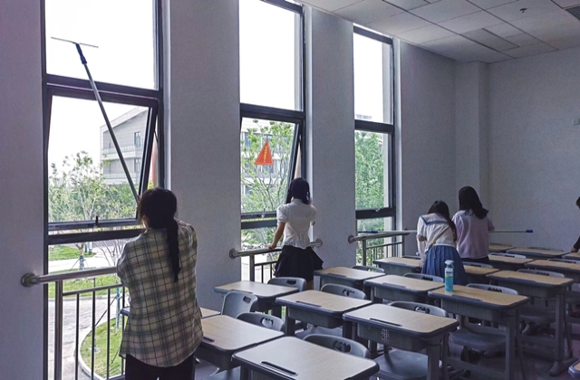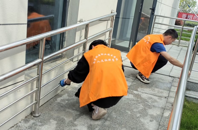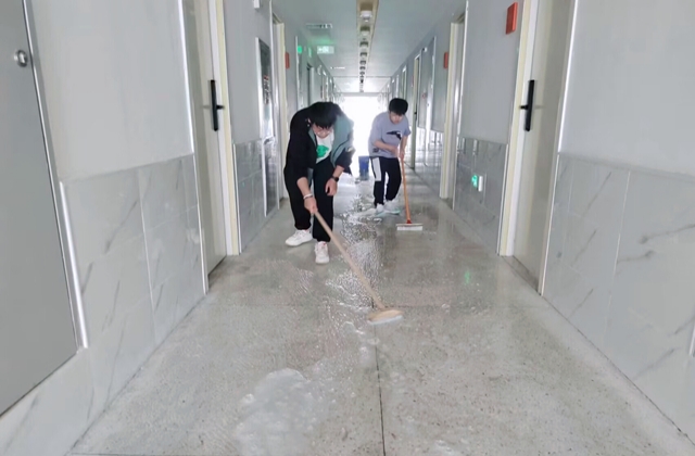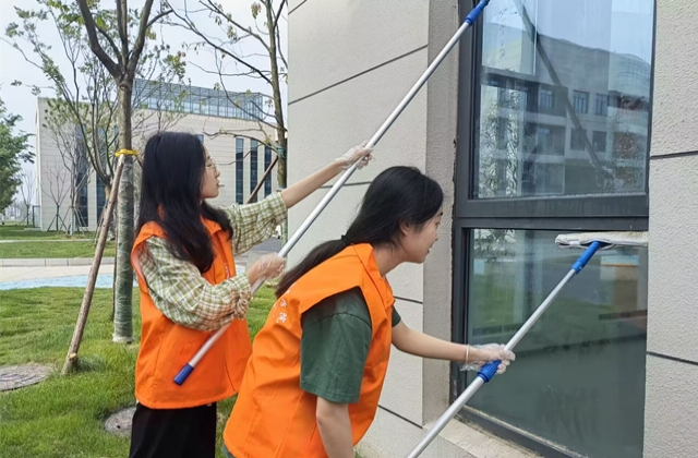 志愿服务活动中,大学生志愿者们主要负责教学楼的桌椅整理、教室内外的打扫、窗户幕墙的清洁工作,另外还配套开展了教学楼和宿舍区周边的草坪清理工作。