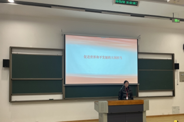 章老师围绕着“促进世界和平发展的大国担当”这一主题,分别从“新时代中国的外交理念和影响”“我国发展面临的外部挑战”“促进世界和平的中国特色大国外交”三方面进行深入的阐述。她指出,新时代十年的伟大变革,为我国全面建成社会主义现代化强国,全面推进中华民族伟大复兴,奠定了丰厚的物质基础,也为我国在国际社会发挥更大的作用积累了重要条件。作为世界和平的建设者、全球发展的贡献者、国际秩序的维护者和全球公共产品的提供者,中国的国际影响力、感召力塑造力显著提升。