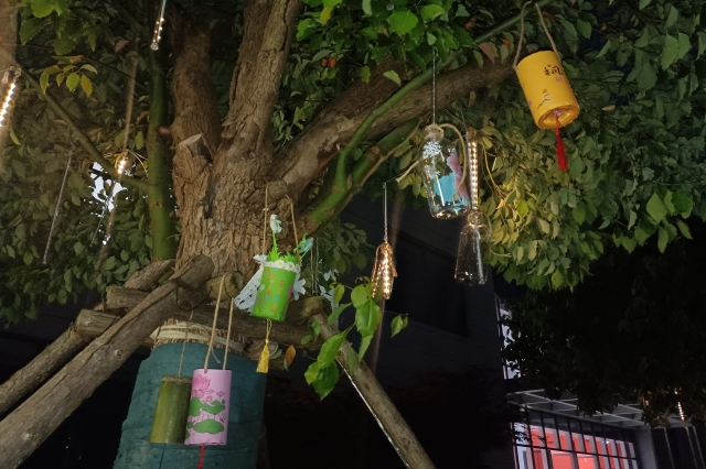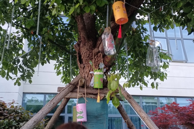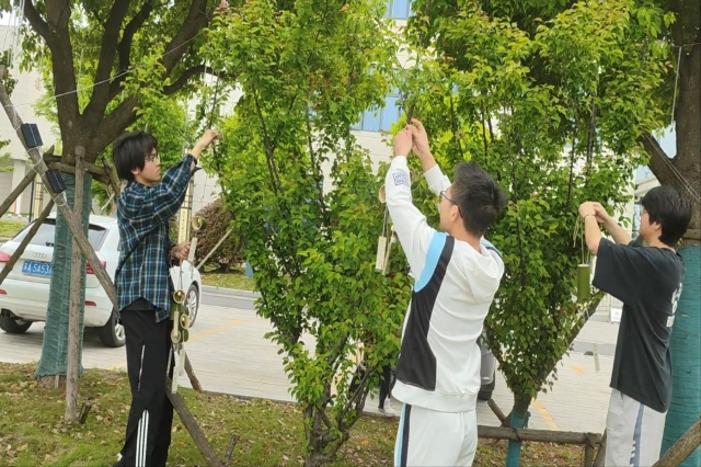 制作完成后,同学们积极投入到美化校园的行动中,将这些精美的手工艺品放置在校园的各个角落。飞花令灯笼、竹筒风铃、彩色飞花令牌等作品共同绘制出了一幅幅美丽的校园图景,为校园增添了浓厚的文化氛围。