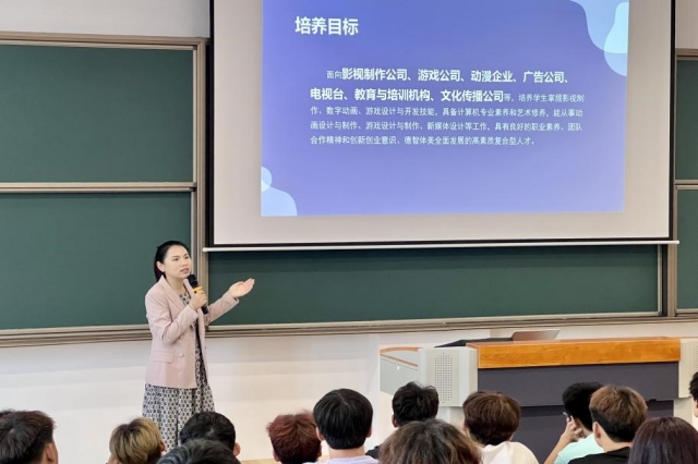 在介绍过程中,曹老师还分享了自己在数字媒体技术领域的教学经验和见解,鼓励新生们要珍惜大学时光,努力学习专业知识,积极参与各类实践活动,不断提升自己的综合素质和竞争力。她还特别强调了团队合作和沟通能力的重要性,希望新生们能够在未来的学习和工作中,学会与他人协作、共同进步。