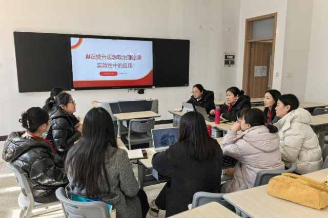 会上,思政教师们围绕AI技术如何助力思政教学进行研讨。李一敏老师提出利用AI技术打造智慧教室环境下的思政课程。通过智能教学平台,教师可以根据学生的学习数据(由AI分析得出的课堂参与度、作业完成情况、知识掌握程度等),针对性地调整思政课教学内容和进度,实现个性化教学。老师们对此展开了热烈的讨论,大家一致认为,AI技术能够为思政教学提供更加精准的学情分析,助力因材施教,从而提升教学的针对性和实效性。