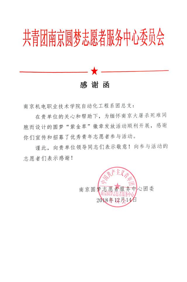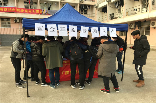 12月12日下两点,我系团员青年们在党支部的带领下携手南京圆梦公益志愿者服务中心团委在我院宿舍二栋广场前开展了一次“紫金草”纪念徽章发放活动。