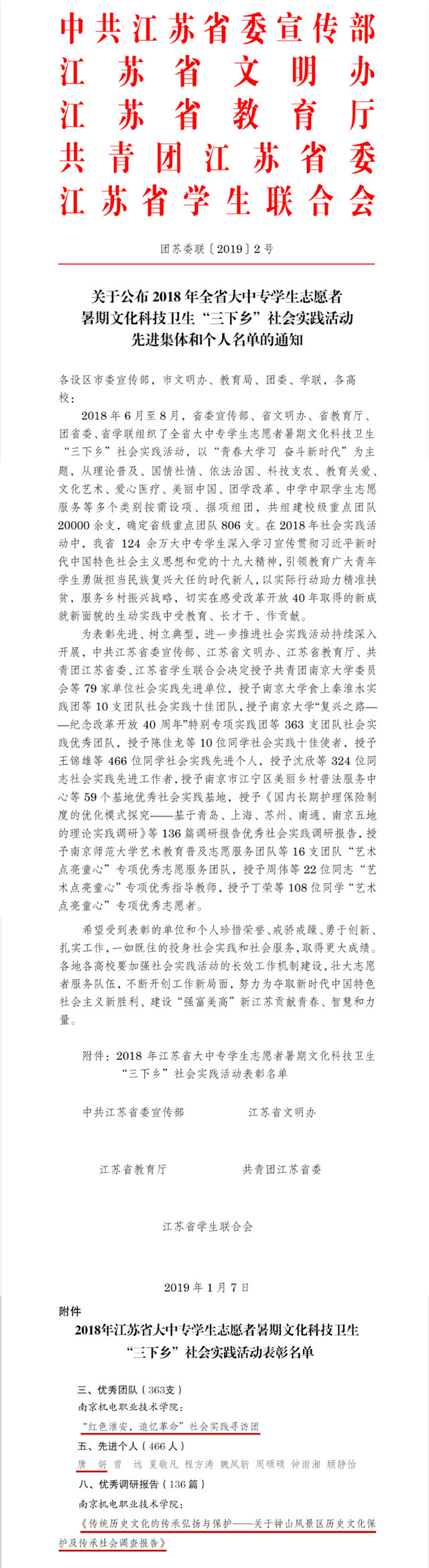 近日,中国共产主义青年团江苏省委员会对在2018年江苏省大中专学生志愿者暑期文化科技卫生“三下乡”社会实践活动表现突出的单位进行表彰通报表扬。我院“红色淮安,追忆革命”社会实践寻访团,荣获“优秀团队”荣誉称号;《传统历史文化的传承弘扬与保护——关于钟山风景区历史文化保护及传承社会调查报告》荣获“优秀调研报告”荣誉称号;人文社科系会计172团支部唐妍同学荣获“先进个人”荣誉称号。