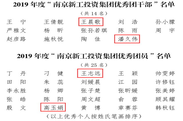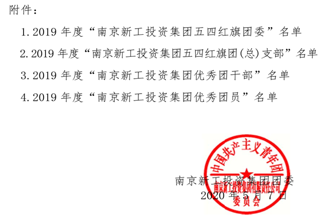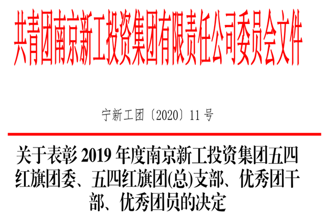 2019年以来,各级团组织、团干部和广大团员青年深入学习贯彻习近平新时代中国特色社会主义思想和党的十九大精神,树牢“四个意识”、坚定“四个自信”、坚决做到“两个维护”,奋发有为、真抓实干,推动共青团工作取得了新的成绩,涌现出一批先进集体和先进个人。为表彰先进,树立典型,引导和激励广大团员、团干部和各级团组织不断进取,再创佳绩,新工投资集团团委决定,授予乐投线上平台(集团)官方网站团委“2019年度南京新工投资集团五四红旗团委”称号;乐投线上平台(集团)官方网站机械工程系团总支“2019年度南京新工投资集团五四红旗团(总)支部”称号;授予潘久伟同志、王晨歌同志“2019年度南京新工投资集团优秀团干部”称号;授予信息工程系学生高玉娟、电子工程系学生王志远“2019年度南京新工投资集团优秀团员”称号。