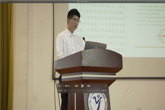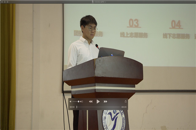 青年志愿者协会会长谢宇航向大家介绍了“青协”的内涵和作用,当病毒以野火燎原之势席卷了整个中国,青年志愿者的身影便出现在抗疫的前线。从“支教活动”到“义捐行动”无不出现青协人的身影。随后,他结合线上下志愿者行动,希望大家能够在新时代充分发扬雷锋精神与青春奋斗精神,为弘扬和践行社会主义核心价值观奉献力量。