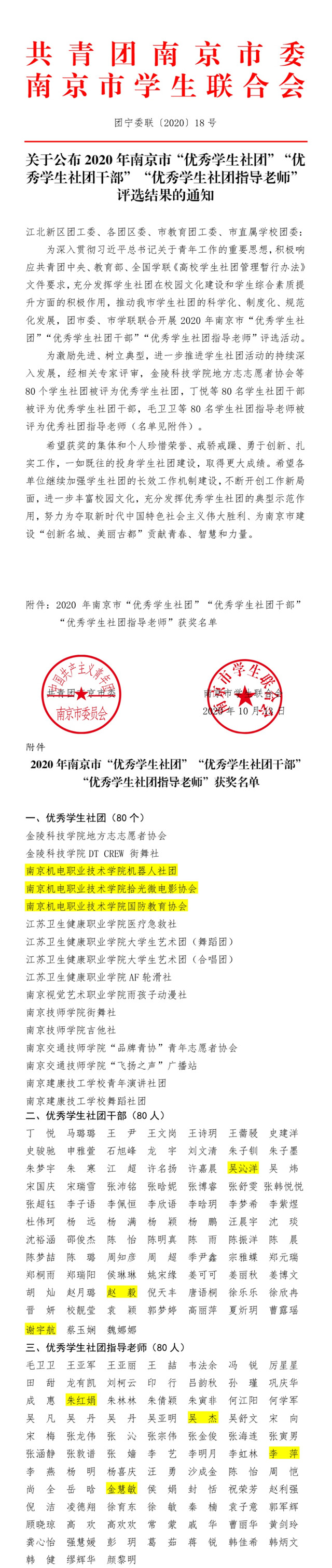 为激励先进、树立典型,进一步推进学生社团活动的持续深入发展,经相关专家评审,我院“机器人社团”、“拾光微电影协会”、“国防教育协会”别评为南京市“优秀学生社团”;吴沁洋、赵毅、谢宇航等三名同学被评为南京市“优秀学生社团干部”;朱红娟、吴杰、李萍、金慧敏等四名老师被评为南京市“优秀学生社团指导老师”。