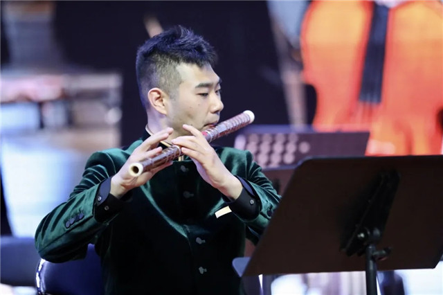 《天使之梦》由二胡、竹笛、扬琴、古筝、琵琶五件乐器共同演绎。乐曲旋律唯美动听,耐人寻味,描绘了少女翩翩起舞的美妙画面,表现了东方少女对美好未来的憧憬。一首《芦苇荡》瞬间将音乐会推向一个小高潮。这首为电影《大话西游》所做的洞箫曲,代入感极强,低沉而悠扬,令人感慨万千。唢呐一响,惊艳全场。