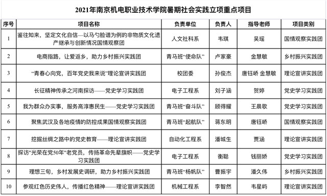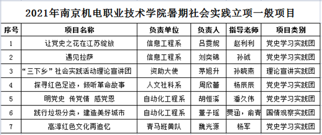 为深入学习宣传贯彻习近平新时代中国特色社会主义思想,贯彻落实习近平总书记关于青年工作的重要思想,引导和帮助广大青年学生上好与现实相结合的“大思政课”,在社会课堂中受教育、长才干、作贡献,在观察实践中学党史、强信念、跟党走,努力成为担当民族复兴大任的时代新人,以实际行动庆祝中国共产党成立100周年,按照团省委《关于开展2021年全省大中专学生志愿者暑期文化科技卫生“三下乡”社会实践活动的通知》相关要求,经自主申报,各团总支、青马班审核推荐,校级专家评审,确定以下10个项目为2021年乐投线上平台(集团)官方网站暑期社会实践重点立项项目,7个项目为2021年乐投线上平台(集团)官方网站暑期社会实践立项一般项目,并对立项的校级重点项目和一般项目进行经费支持,现公示如下: