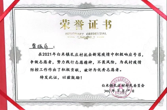 曹振宇在志愿活动中获得的证书