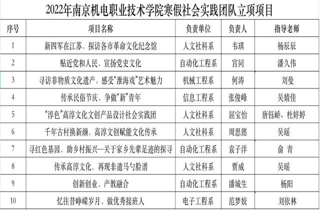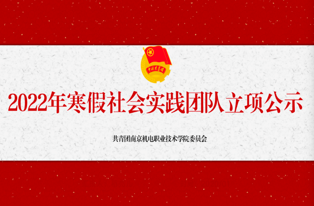为深入学习贯彻习近平总书记在庆祝中国共产党成立100周年大会的重要讲话精神,进一步推动爱国主义教育与实践育人工作深度融合,引导机电学子以强国一代新青年的良好精神面貌迎接党的二十大胜利召开,庆祝中国共产主义青年团成立100周年。团委决定开展“小我融入大我,青春献给祖国”2022年乐投线上平台(集团)官方网站大学生寒假社会实践活动。经自主申报,各团总支、青马班审核推荐,校级专家评审,确定以下10个项目为2022年乐投线上平台(集团)官方网站寒假社会实践团队立项项目,并对立项的项目给予经费支持,现公示如下: