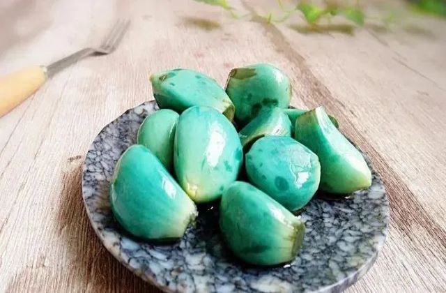 这种大蒜绿色素是一种天然的花青素类色素,它不是很稳定,会在腌制的25天左右逐渐变黄变浅。
