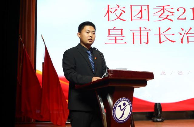 大二学生干部代表校团委学生副书记皇甫长治同学在发言中给同学们分享了他的从大一到大二这一年来的心得。他表示,作为学生干部,要先是学生,配合老师完成工作的同时,正确处理好学习和工作的关系,以便于更好的发挥学生组织在思想政治教育中的桥梁纽带作用。并且学生干部要特别注重团队合作,培养团队合作意识。培养团队合作意识要从学会欣赏开始。让我们更加坚定做“眼里有光,心中有爱,手里有活,脚下有路”的四有机电人。