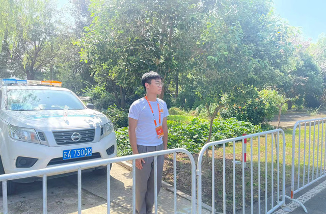 9月17日凌晨5:20志愿者们穿着统一制作的志愿服,佩戴工作牌准时出发,于7:00到达指定岗位,和工作人员一起布置好铁马和警戒带。