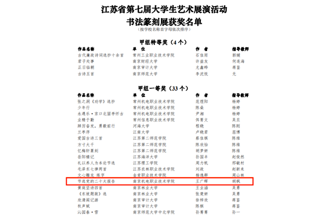 我校信息工程系王广晖同学在江苏省第七届大学生艺术展演活动中喜获书法篆刻类艺术作品一等奖!感谢所有为大赛付出辛劳的老师与同学们。
