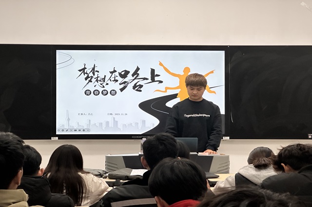 青年有理想,国家有未来,民族有希望。我们在追梦路上流下的汗水、战胜的困难,经过岁月的沉淀,都将成为宝贵的精神财富,化为人生厚积薄发的力量。奋斗者,正青春。2023年12月6日下午5点25分电子工程系团总支组织部部长吕乙在思学楼107为物联网222班的同学们分享了关于“梦想在路上”的信仰公开课,旨在激励同学们做肩上有担当,胸中有理想,坚定讲信仰,永远讲团结的奋进者、践行者。