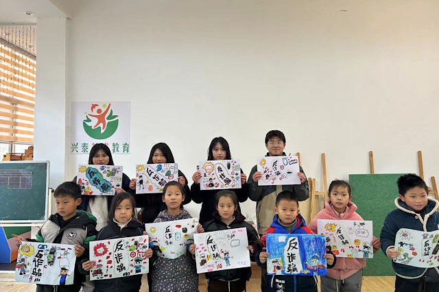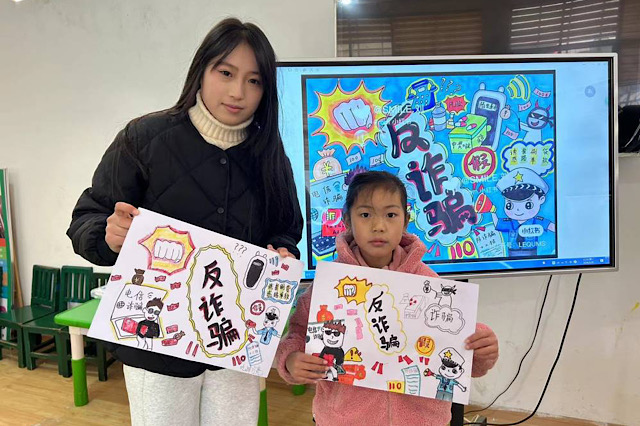 在2024年1月29日,团队第一站来到了赣榆区沙河镇艺术教育机构,为孩子们上了一节“不一样的创意课”,由团队成员葛凡琪为孩子们上了一节安全教育防范诈骗宣传课,从什么是电信诈骗到电信诈骗案例以及防范方法,最后再让孩子们画出反诈宣传。