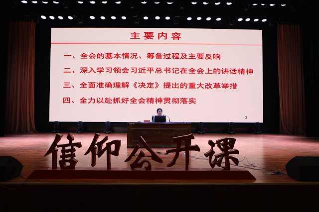 黄莹老师以深入浅出的方式,介绍了全会的基本情况、筹备过程及主要反响,深入学习领会习近平总书记在全会上的讲话精神,帮助学生们全面准确理解《决定》提出的重大改革举措,详细阐述了党的二十届三中全会的重大意义、核心内容和深远影响,学生们深刻认识到全面深化改革对于推进中国式现代化的重大意义。她指出,此次全会是在全面建设社会主义现代化国家的关键时期召开的一次重要会议,为新时代新征程的改革发展提供了根本遵循和行动指南。希望同学们能够把学习贯彻党的二十届三中全会精神与党史学习教育紧密结合起来,不断汲取智慧力量,坚定理想信念,强化责任担当,为推动学校各项事业高质量发展贡献自己的力量。