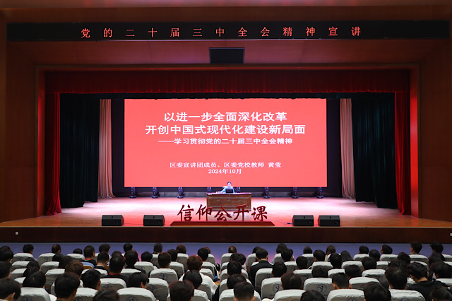 2024年10月16日,学校在青春剧场举行了一场以学习贯彻党的二十届三中全会精神为主题的宣讲会,各级团学骨干踊跃参与。此次培训特邀中共南京市高淳区委党校业务工作指导科科长,高淳区“淳风化语”宣讲团成员黄莹担任主讲人。黄莹老师围绕党的二十届三中全会精神,聚焦“全面深化改革,开创现代化建设新局面”,进一步提升学生的政治素养和改革意识,为学校发展注入新动力。