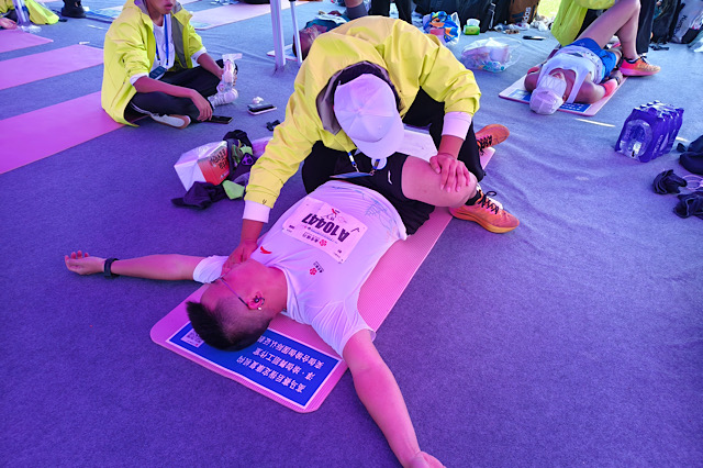 赛后,拉伸组的志愿者们化身为选手们的康复师,帮助他们进行适当的拉伸,缓解肌肉疲劳,让选手们能够更快地恢复体力。各组成员之间分工明确,配合默契,有条不紊地运转着,共同为赛事的圆满成功贡献着自己的力量。