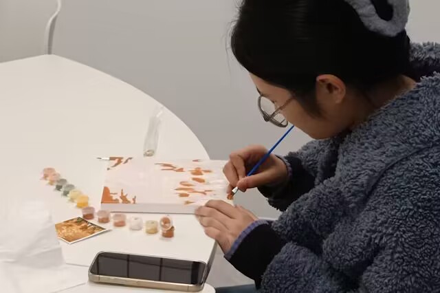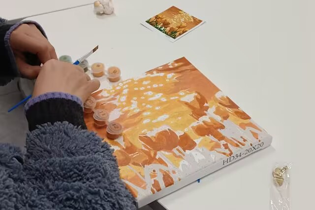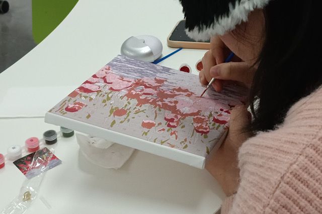 活动现场,同学们热情满怀,纷纷沉浸在自己的创作世界中。她们依据画布上的数字提示,精心挑选颜料,细致地涂抹每一个区域。有的同学专注于描绘玫瑰的娇艳花瓣,用细腻的笔触和丰富的色彩展现其高贵与妩媚;有的则钟情于勾勒雏菊的清新淡雅,以简约的色调和流畅的线条诠释其质朴之美;还有的同学大胆尝试,将不同种类花卉的元素巧妙融合,创作出独一无二的梦幻花境。在同学们的笔下,原本空白的画布逐渐被五彩斑斓的花朵填满,或含苞待放,或肆意盛开,每一幅都仿佛散发着迷人的芬芳,诉说着同学们对美的独特理解与感悟。