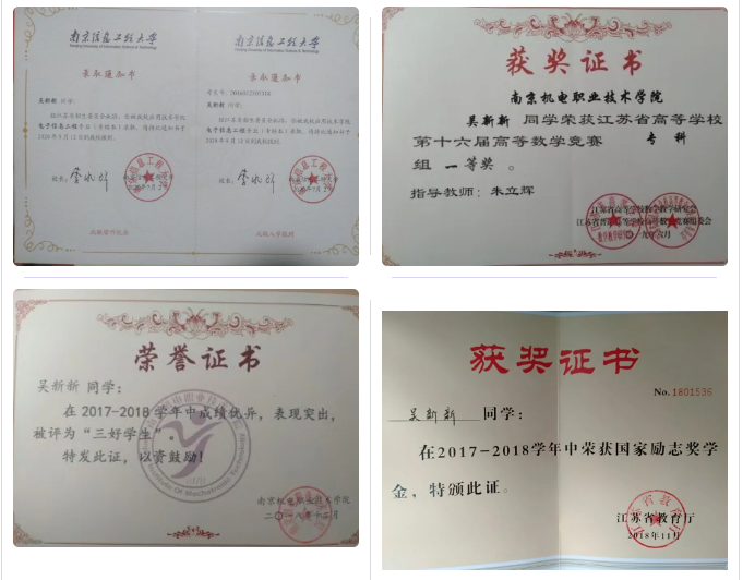 2018-2019年:国家励志奖学金、江苏省高等数学竞赛专科组一等奖;