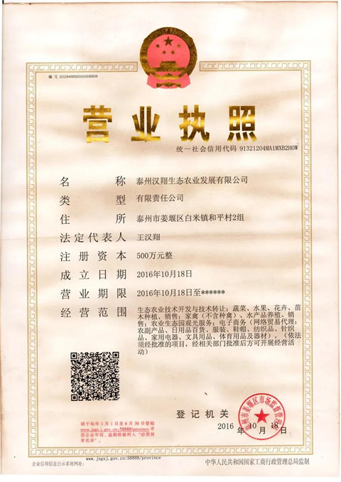 2016年10月-至今:泰州汉翔生态农业发展有限公司 总经理