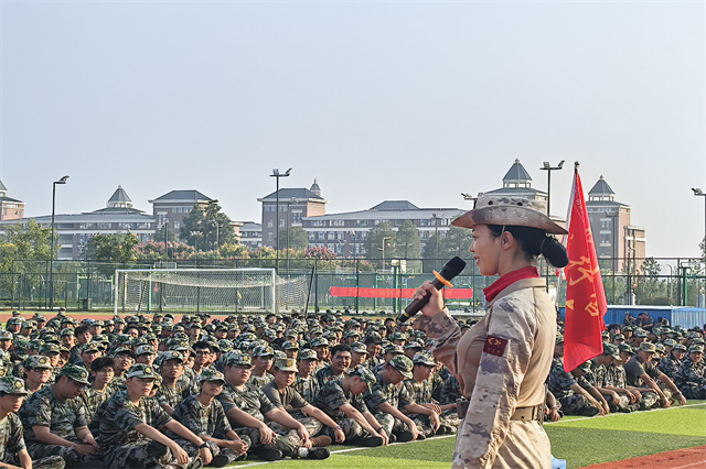 当天下午,阅兵精神主题报告会在学校操场率先举行,2025级全体新生及教师代表到场聆听。左星桥校友以“从天安门到母校:阅兵场上的坚持与蜕变”为题,深情回顾了从严格选拔到封闭集训,再到最终走过天安门接受检阅的全过程。她详细讲述了参阅民兵方队“优中选优”的严苛筛选标准,以及为达到“毫米级”动作精度所付出的艰辛努力。左星桥将个人感悟凝练为“坚持”“责任”“奉献”“集体”四个关键词,通过王二小、八女投江等英雄事迹的感悟,以及训练中教练员、保障人员默默奉献的生动事例,深刻阐释了阅兵精神的丰富内涵与时代价值。她鼓励学弟学妹们勇于突破自我设限,将个人成长融入国家发展,在正确的道路上坚持前行,其真挚的情感与昂扬的精神感染了现场每一位师生,掌声经久不息。