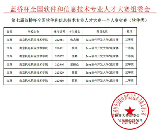 南京赛区的竞赛组织工作从3月初启动,院系领导高度重视此次竞赛,并给予了大力的支持。在信息工程系刘娴老师、任荣君老师和卞志勇老师的精心指导下,参赛选手们认真备赛,在比赛时发挥出色,最终取得了优异的竞赛成绩,其中沈鹏、邵勉同学获得Java软件开发二等奖,杨洋、王恒众、管菲、朱志端同学获得Java软件开发三等奖。