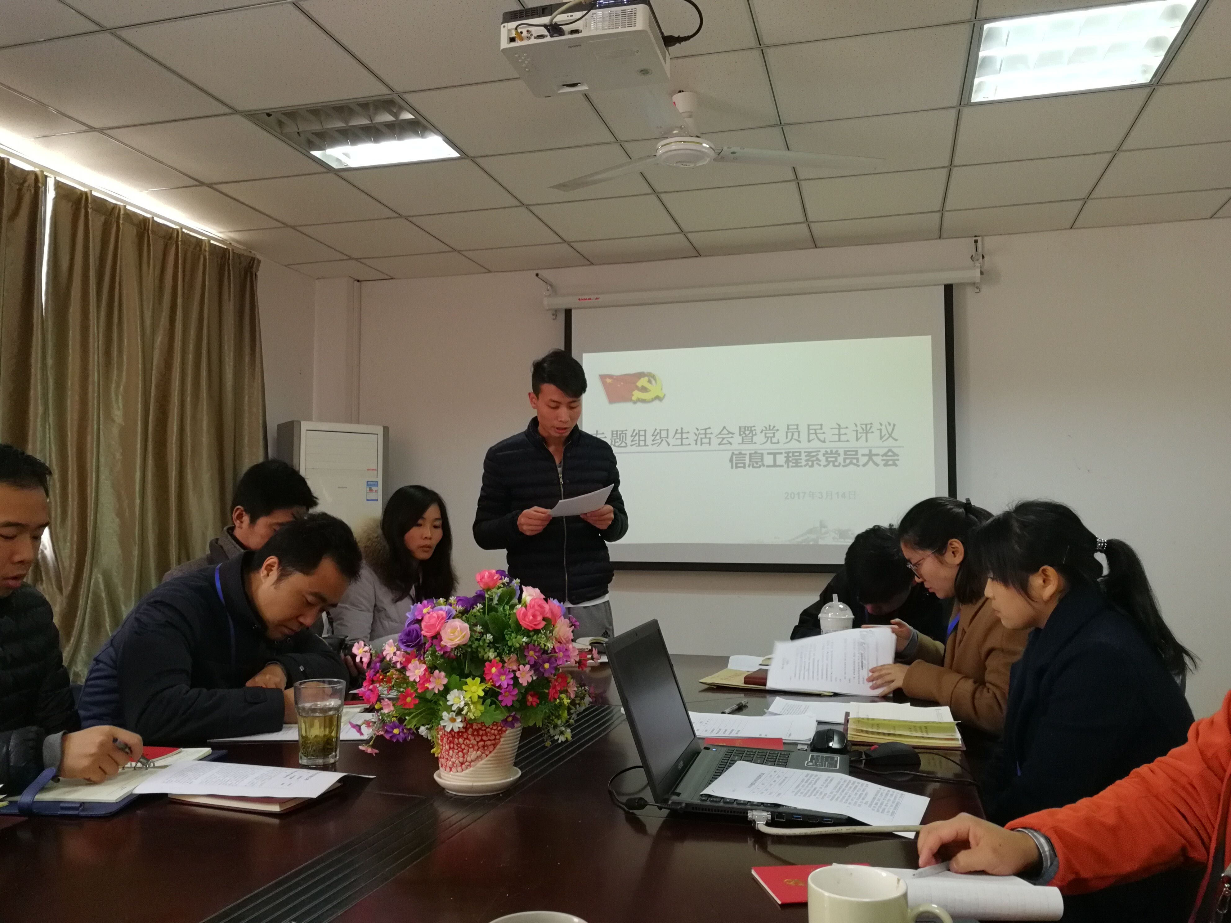 为认真贯彻落实党的十八届六中全会精神, 按照学校党委《在“两学一做”学习教育中召开专题组织生活会和开展民主评议党员工作方案》的要求,结合机关党委的相关部署,3月14日下午,信息工程系党支部组织召开“两学一做”专题组织生活会和党员民主评议会议。党支部副书记胡枫同志主持会议,学院党委委员、副院长赵学洪同志以普通党员身份参加了组织生活会,大会应到党员16名,实到党员14名,事假、病假各1名。
