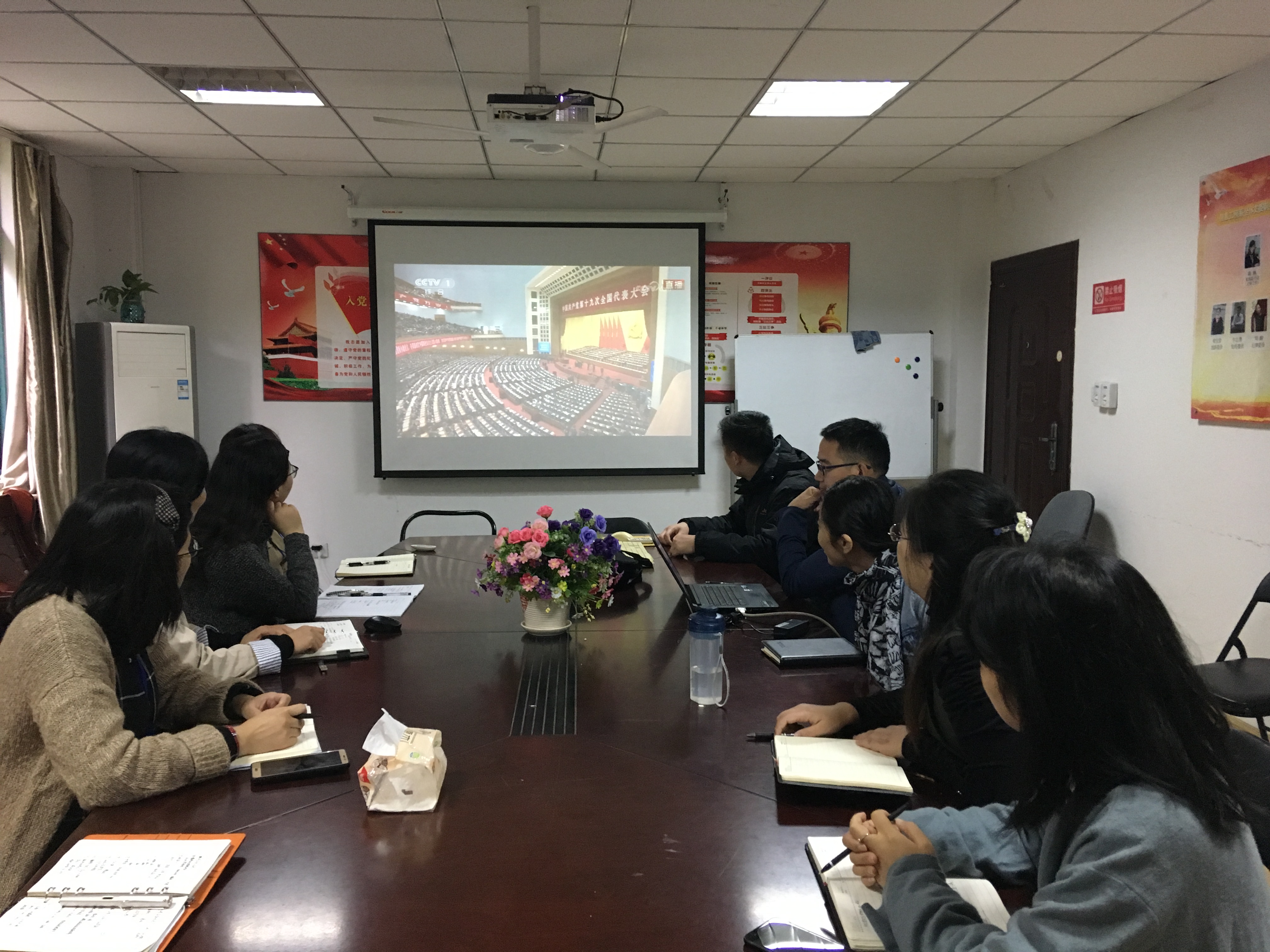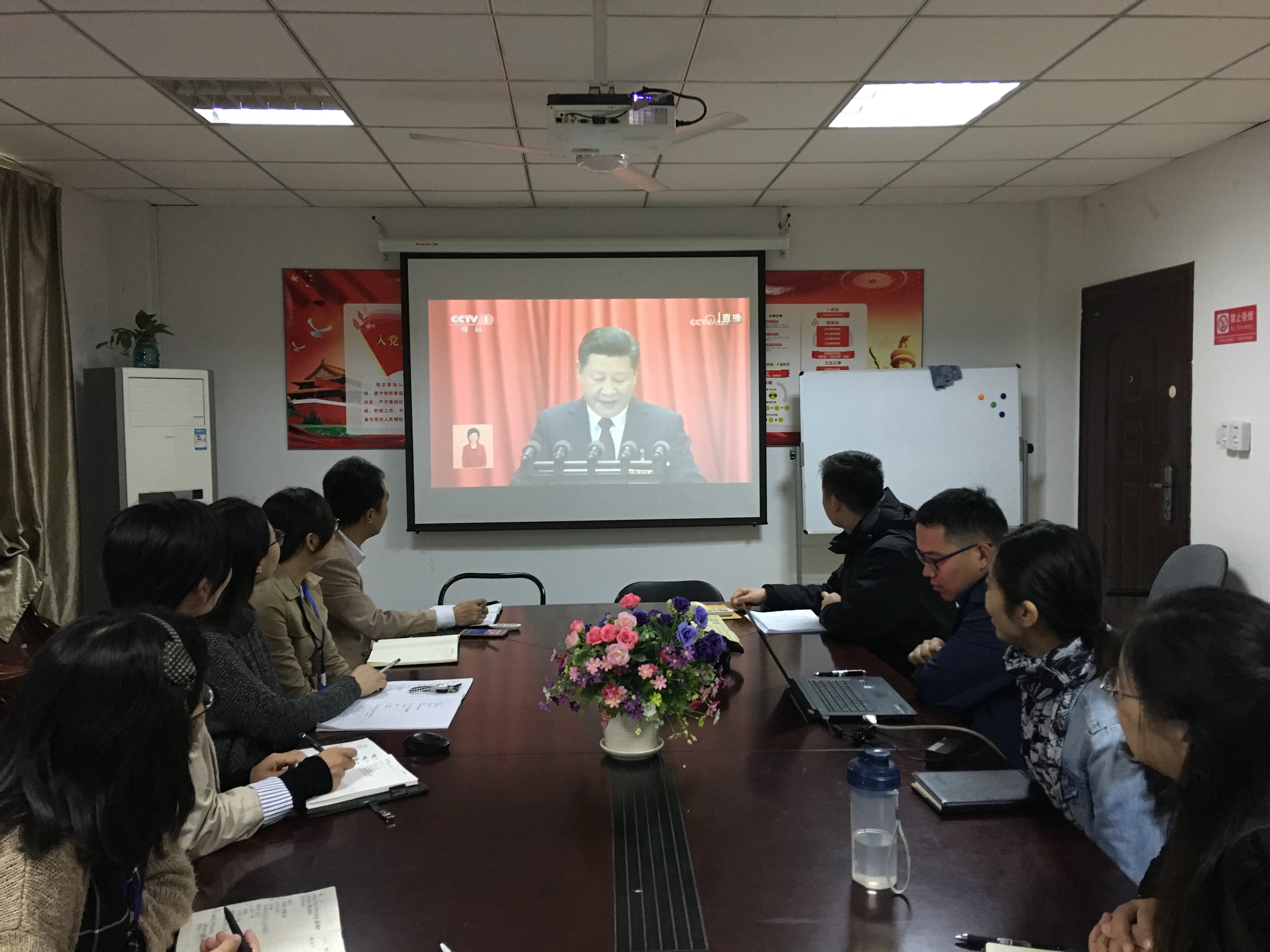 大家秩序井然地观看开幕式盛况,聚精会神。报告主题为:不忘初心、牢记使命,高举中国特色社会主义伟大旗帜,决胜全面建成小康社会,夺取新时代中国特色社会主义伟大胜利,为实现中华民族伟大复兴的中国梦不懈奋斗。大家仔细聆听报告,认真做好记录,每到精彩之处,会场不时响起热烈的掌声。习近平总书记的报告让大家深受鼓舞、倍感振奋。大家一致认为,习近平总书记的讲话内涵丰富、高屋建瓴,讲话站在历史和时代的高度,深刻洞察和把握世界发展大势和当代中国现实,深刻阐述了党的十八大以来,以习近平同志为核心的党中央团结带领全党全国各族人民坚持和发展中国特色社会主义的历史进程和宝贵经验,深入分析当前国际国内形势,全面把握党和国家事业发展新要求和人民群众新期待,制定适应时代要求的行动纲领和大政方针,动员全党全国各族人民坚定中国特色社会主义道路自信、理论自信、制度自信、文化自信,继续统筹推进“五位一体”总体布局、协调推进“四个全面”战略布局,继续推进党的建设新的伟大工程,对于团结动员全党全国各族人民不忘初心、继续前进,高举中国特色社会主义伟大旗帜,为决胜全面建成小康社会实现中国梦而奋斗,具有十分重要的意义。中国共产党第十九次全国代表大会,是在中国特色社会主义发展关键时期召开的一次十分重要的大会,是一次肩负重大使命的历史性盛会,是全党全国各族人民政治生活中的一件大事。