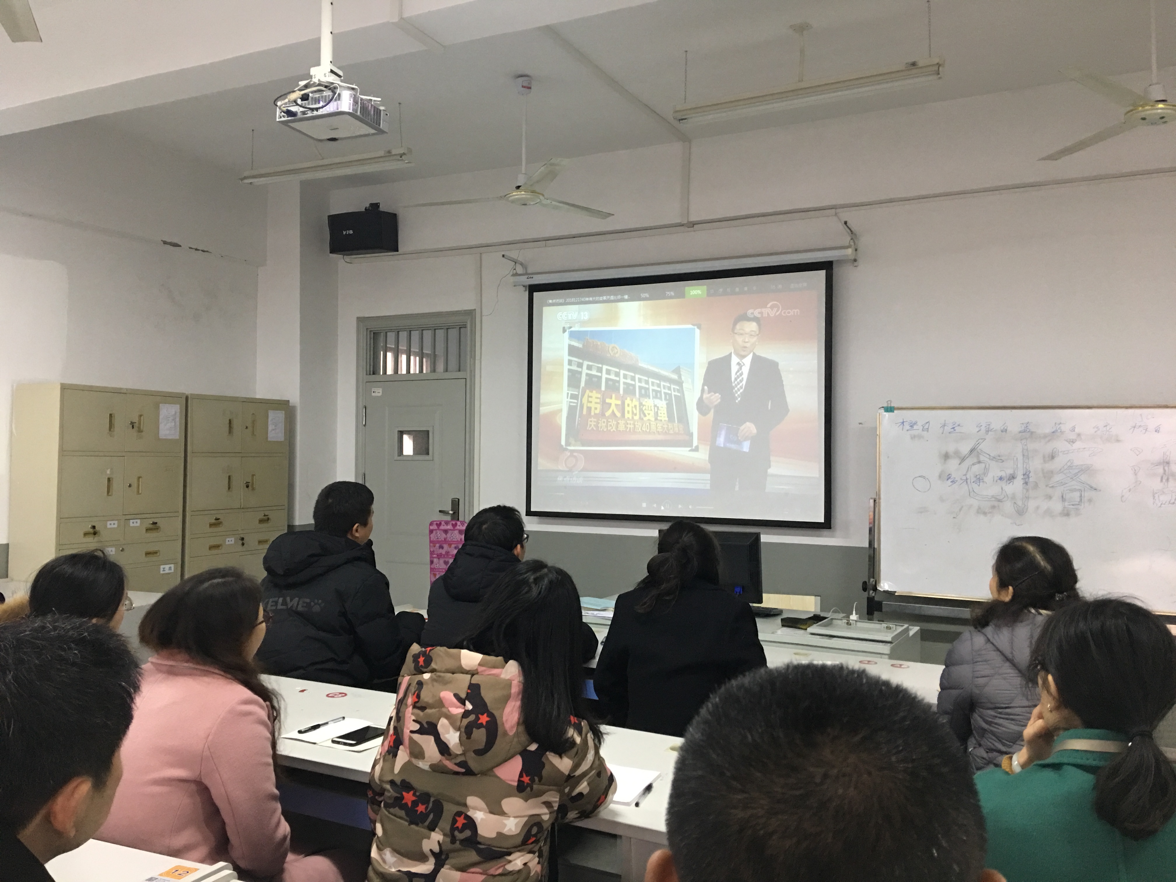 本次学习分为两个阶段进行:第一阶段是集体观看了中央电视台《焦点访谈》节目中播出的庆祝改革开放四十周年系列节目-“天涯比邻一键通—改革开放通信行业40年伟大改革”视频。视频中系统的回顾了改革开放以来我国的通信业发展历程,我国的通信业从落后到追赶,一直到现在我们的同步甚至在某些方面的领先。看到我们一点一点的进步,一点一点的飞越,老师们心中的自豪感油然而生。胡书记表示,回顾改革开放40年的光辉历程,我们取得的成绩是辉煌的,但是我们后面的路还很长,也很艰难,在这个历史时刻,我们要总结改革开放的伟大成就和宝贵经验,动员全党全国各族人民在新时代继续把改革开放推向前进,为实现“两个一百年”奋斗目标、实现中华民族伟大复兴的中国梦不懈奋斗。随后的第二阶段,全体党员老师分享了自身对于改革开放40周年的感触,大家纷纷表示中国改革开放以来发生了翻天覆地的变化,取得的成绩是举世瞩目的,我们每个人都是受益者、经历者。当前中国特色社会主义进入了新时代,我们要坚持全面深化改革,充分发挥我国社会主义制度优越性。