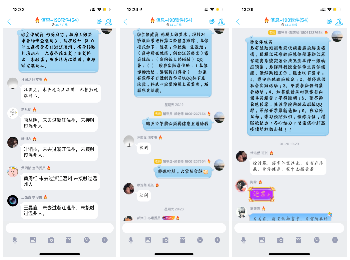 密切关注学校实时动态和决策部署,疫情发生以后,学院和系里下达一系列疫情防控任务,接到各项指令后,郝老师第一时间理清思路,在班级群里发布通知,说明统计信息的原因,让大家不要恐慌、无须害怕、积极配合、如实上报。消除疑虑后,对班级同学目前所在位置、身体状况、有无接触敏感人群进行逐一统计,严格排查,掌握一手消息,坚决做到防控无漏洞。