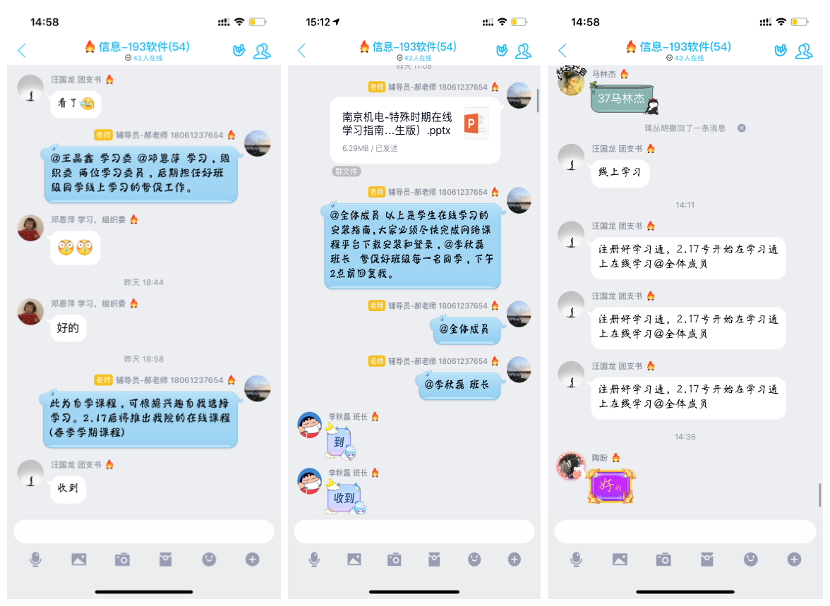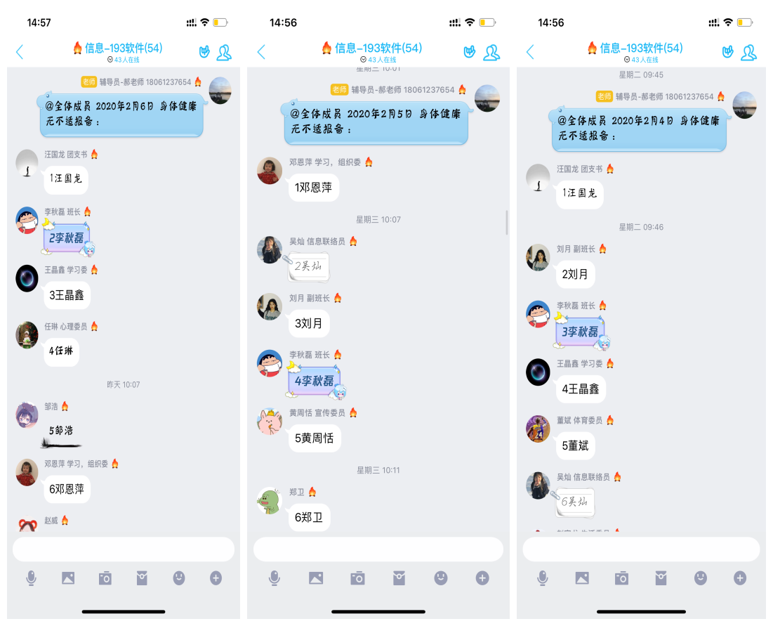 班委各司其职,充分利用网络开展线上班级管理工作,班长负责每日健康报备管理工作,学习委员负责线上网络学习工作,团支书负责抗击疫情文章推送工作。